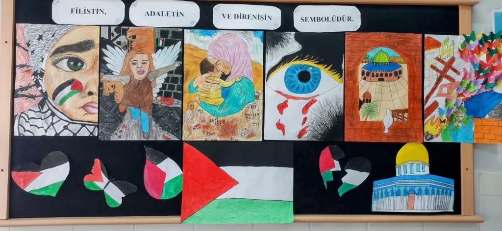 Filkistin'e yapılan baskı ve zulümlerin 3.senesinde okulumuzda yapılan etkinliklerden kareler ve öğrencilerimizin yaptığı çalışmalarla Filistin halkının yanındayız.Allah filistin halkının ve tüm mazlumların yar ve yardımcısı olsun.